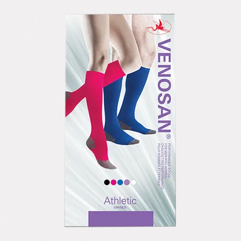 Venosan Athletic unisex compression socks are high performance compression socks, designed for everyday wear, travel, athletic needs, mild edema, prevention and treatment of mild venous symptoms, heaviness and fatigue in the legs and assists in prevention of DVT (Deep Vein Thrombosis). Compression socks are well known to improve circulation to the legs, and to prevent lactic acid buildup during exercise.